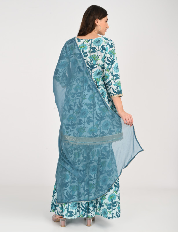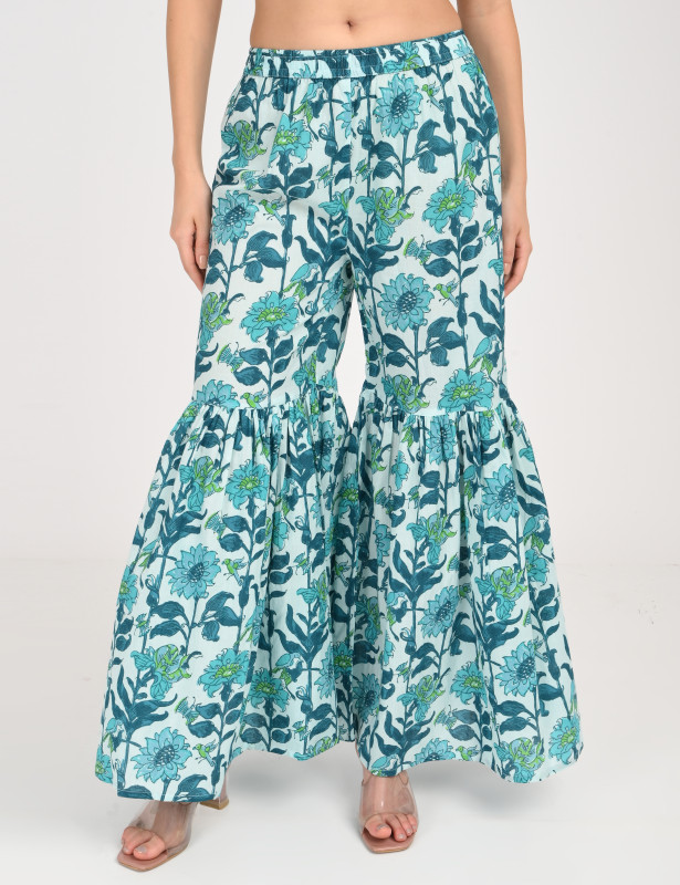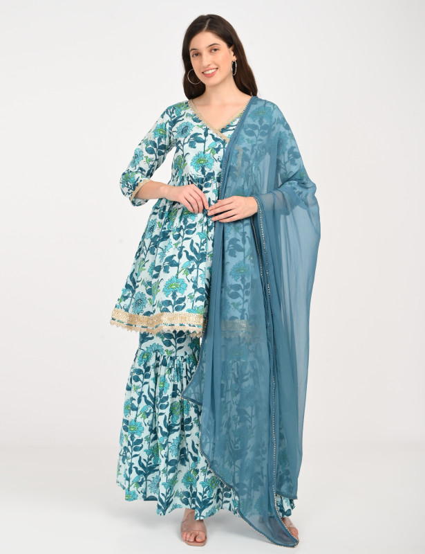 effortless elegance with this Aqua Blue Floral Printed Kurta Sharara Set from